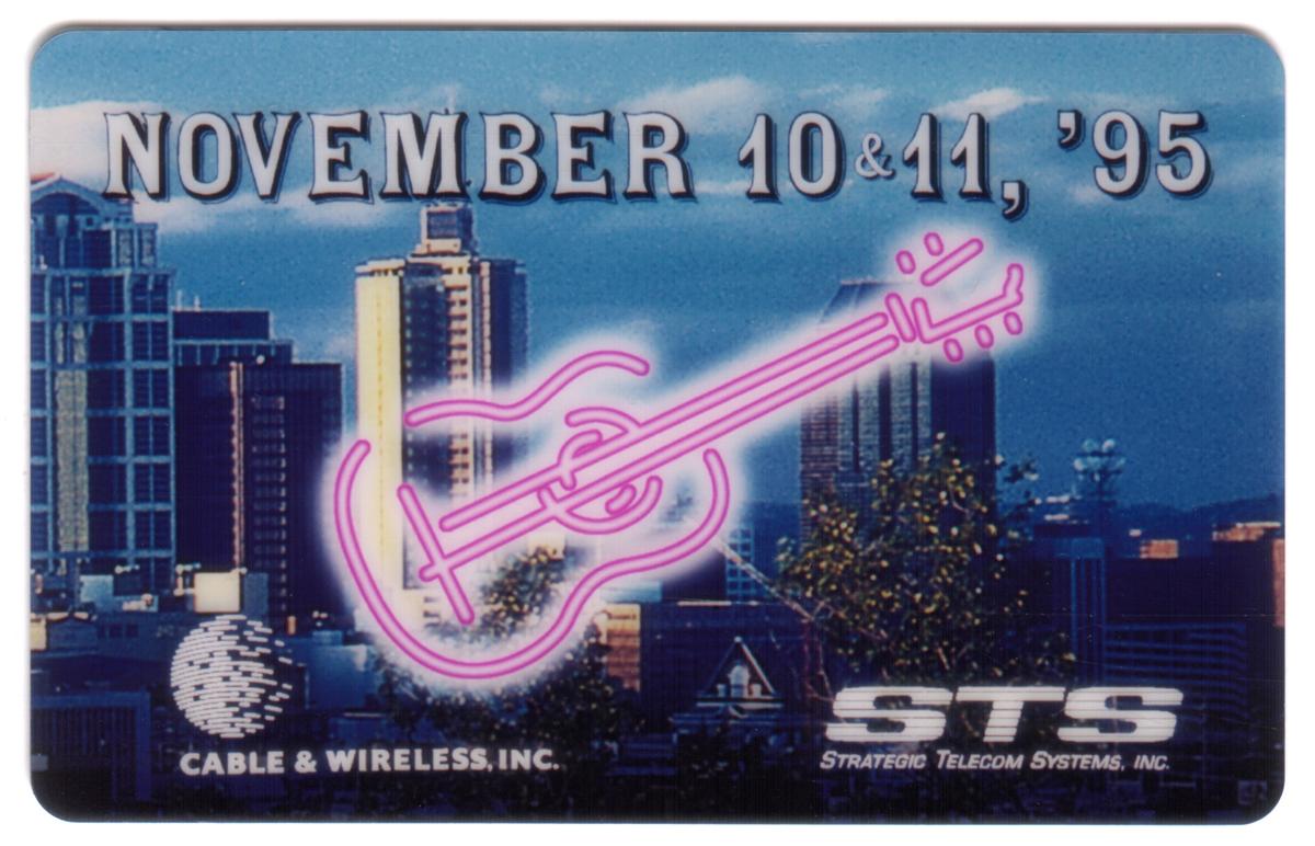 The card commemorates the first annual STS Roundup, a special event held in Nashville in 1995, connected to Cable & Wireless and the CWI STS 1st Conference. The event is represented on the card by text making note of the conference and its association with Nashville. The phone card is part of a puzzle set of three, each valued at five dollars, highlighting its collectible appeal. The design balances the modern city skyline with cultural icons linked to the music and cowboy lifestyle, presenting a dynamic celebration of Nashville’s identity.