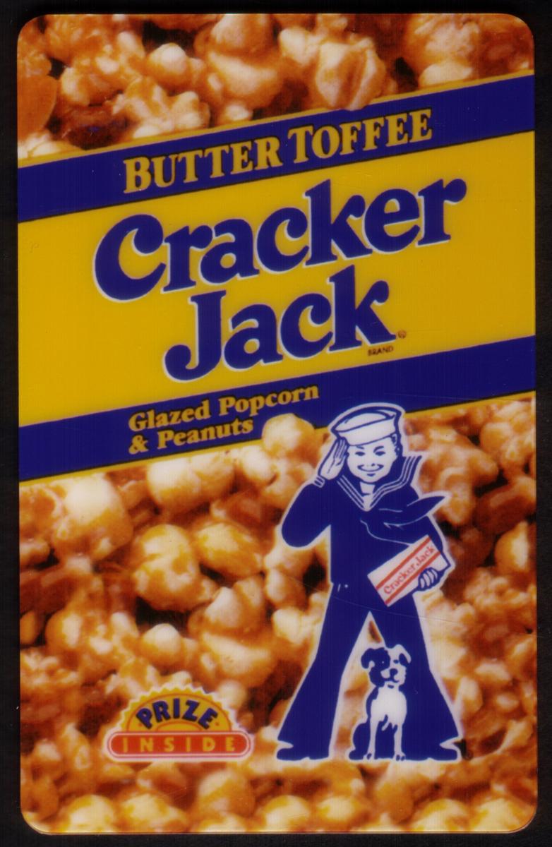 This collectible card features the classic Cracker Jack brand imagery, highlighting a nostalgic Americana theme centered around snacks and treats. The card prominently displays an illustration of a sailor boy character known as Sailor Jack. He is dressed in a traditional navy sailor outfit with a blue collar and white hat, holding a box of Cracker Jack Butter Toffee Popcorn & Peanuts. Next to him, there is a dog character, adding to the familiar Cracker Jack iconography seen through decades of packaging and promotions.