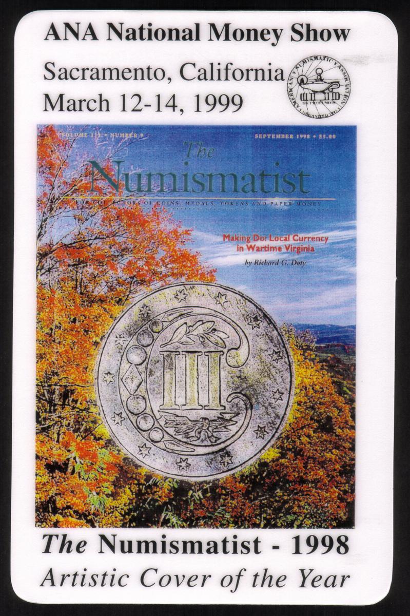This card appears as a collectible related to organizations and events in numismatics and coin collecting, specifically tied to the American Numismatic Association’s National Money Show held in 1999. It highlights aspects of numismatic history and artistry through the featured coin and magazine cover, making it relevant to enthusiasts of currency, coins, and numismatic publications.