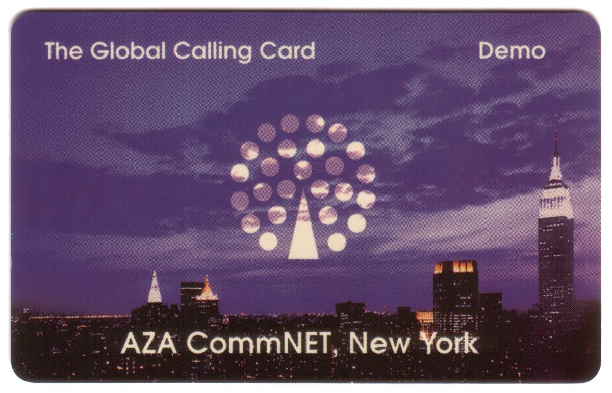 Additional text on the card includes "AZA CommNET Demo Global Calling Card," which identifies the card as a demonstration or sample item related to telecommunications. The overall design emphasizes New York City as a major international destination, highlighting its recognizable skyline and iconic architecture. The card was issued as part of a promotional or travel-themed set, reflecting New York City’s status as a popular location for sightseeing.