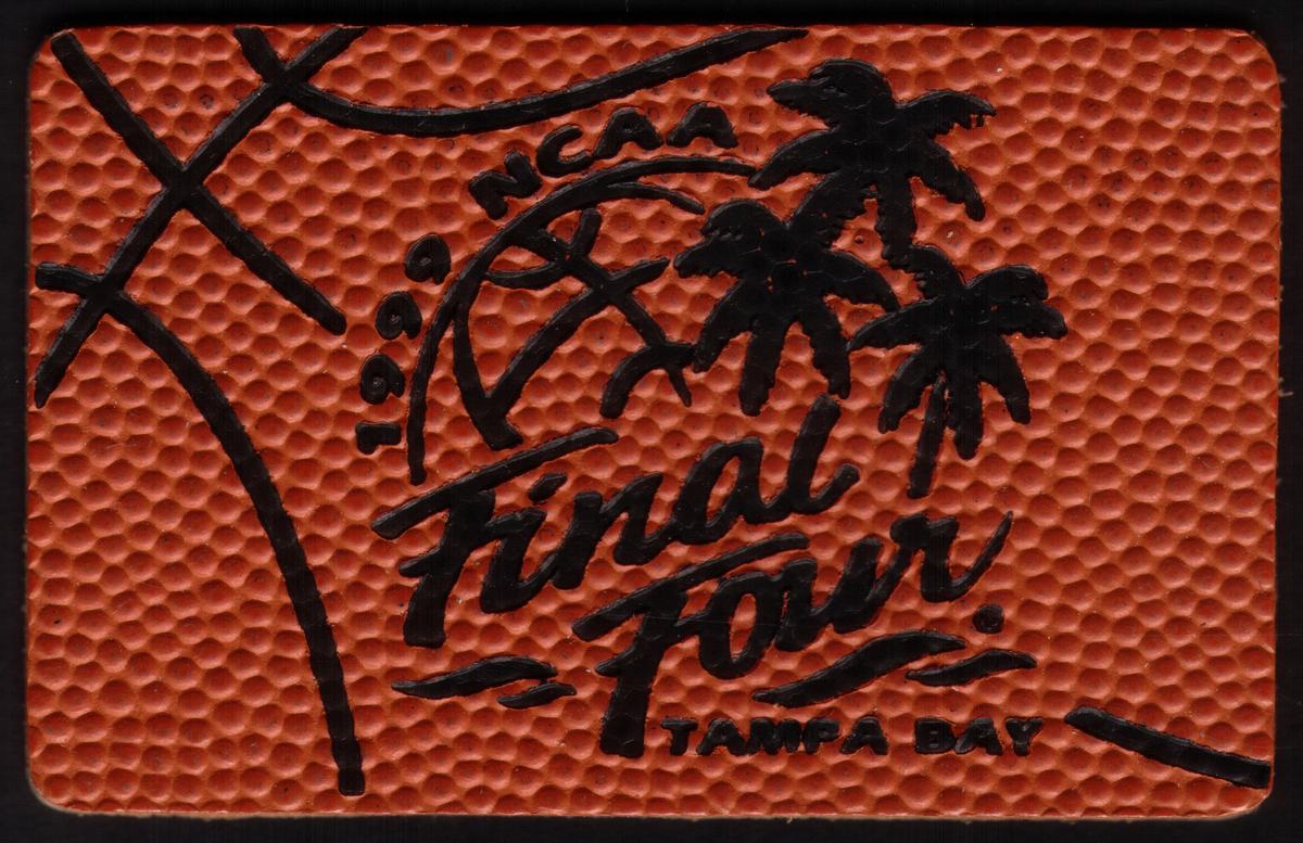 This collectible card features a basketball theme closely tied to the National Collegiate Athletic Association (NCAA) Final Four of 1999. The front of the card displays a detailed image of an official basketball made from genuine Rawlings leather. The basketball bears the official mark, indicating its use in NCAA competition, specifically referencing the 30-minute 1999 NCAA Final Four event. The card highlights Tampa Bay, Florida, as part of the design or location linked to the basketball or event.