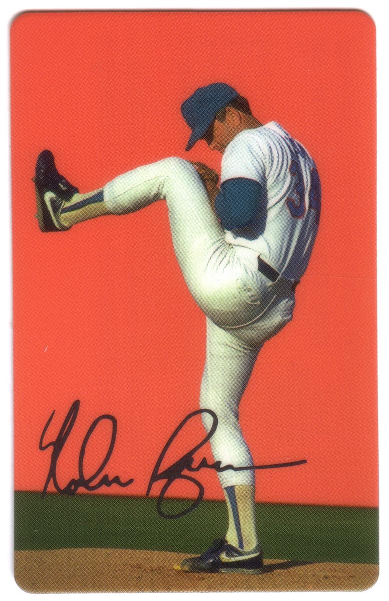 No additional people or settings appear on the card aside from Nolan Ryan. The photograph is clear and focused on his pitching form. There are no other graphics or illustrations present, making the card’s subject and branding the sole visual elements. The card is intended for collectors and sports enthusiasts, featuring one of baseball’s most famous pitchers in action.