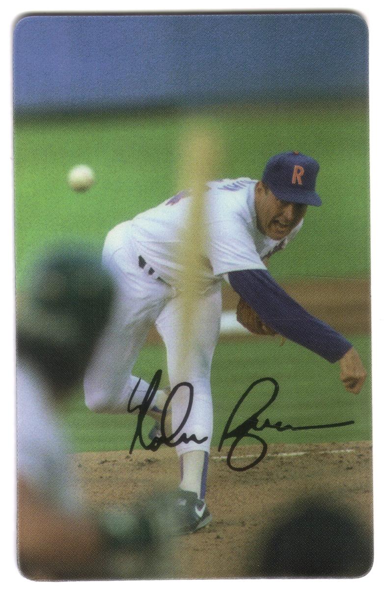This collectible card features a photographic image of Nolan Ryan, a legendary baseball pitcher, captured in the follow-through motion of his pitch. Nolan Ryan is dressed in a white baseball uniform with red and blue piping and a red cap bearing the Texas Rangers logo. The image emphasizes his throwing posture, showcasing his arm extended forward after releasing the ball.