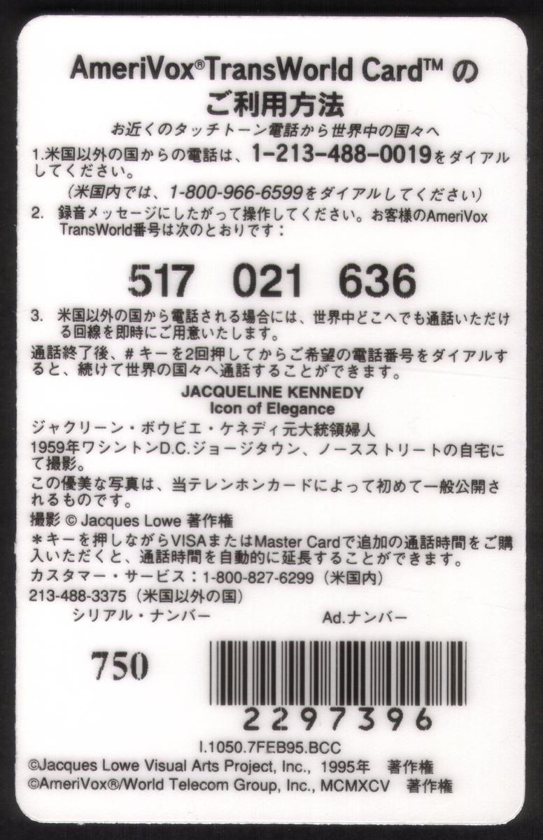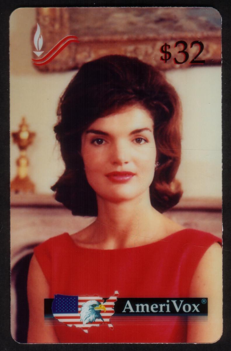 The image captures Jackie Kennedy, a prominent figure from American political history, emphasizing her elegant style during the 1960s. The card is issued by AmeriVox and is part of a collectible series highlighting famous people and political figures.