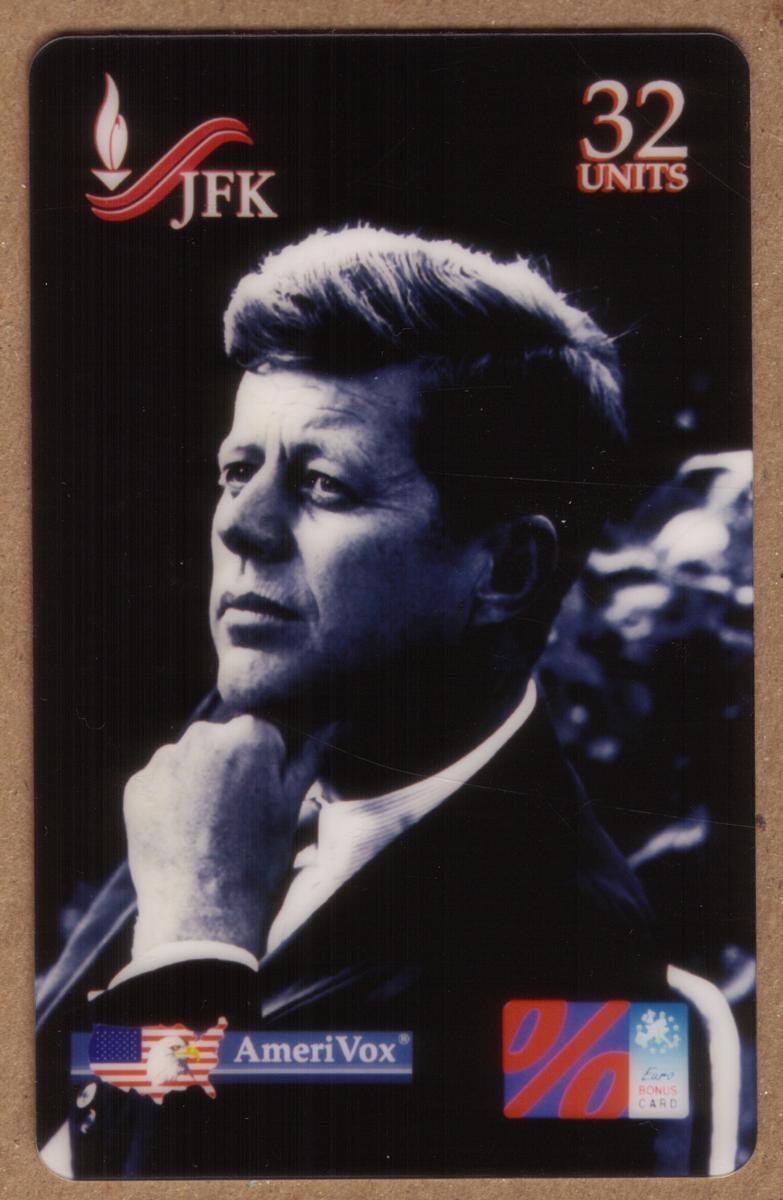 This card commemorates the historical figure John F. Kennedy, the 35th President of the United States, reflecting themes of American politics and civil rights from the 1960s era. It combines patriotic imagery with telecommunications utility, making it a collectible item for those interested in US Presidents and political history.