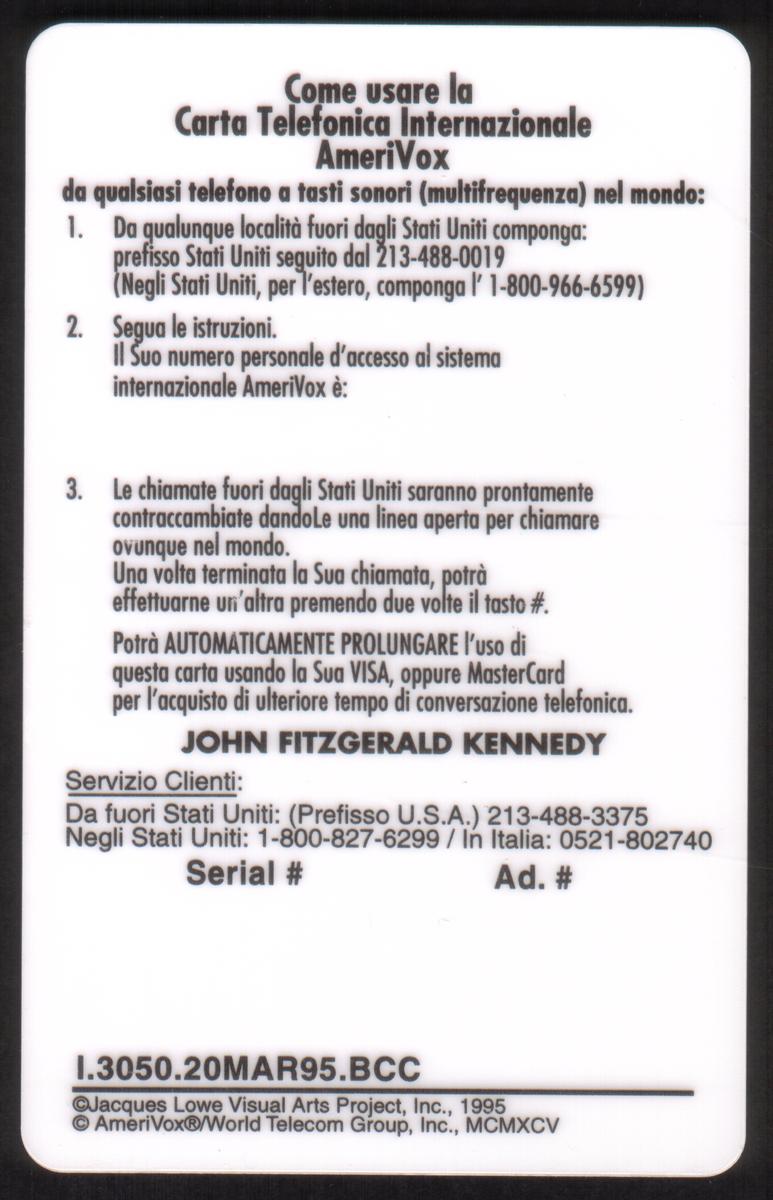 Vintage JFK portrait with flame logo and patriotic symbols, 32 units, detailed instructions, magnetic stripe, and serial number for calling use. |