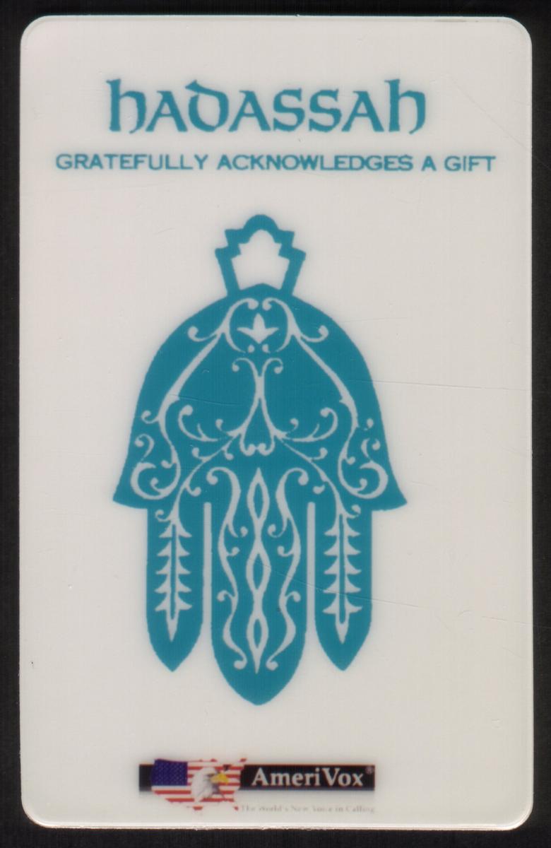At the bottom of the card, there is a logo featuring the American flag and the word "AmeriVox" accompanied by the slogan "The world's News Leader in call alert." This indicates the card’s association with AmeriVox, a company known for telecommunications-related products. The card reflects themes of religion, Jewish women’s organizations, and Judaica, aligning with Hadassah, a prominent Jewish women's organization.