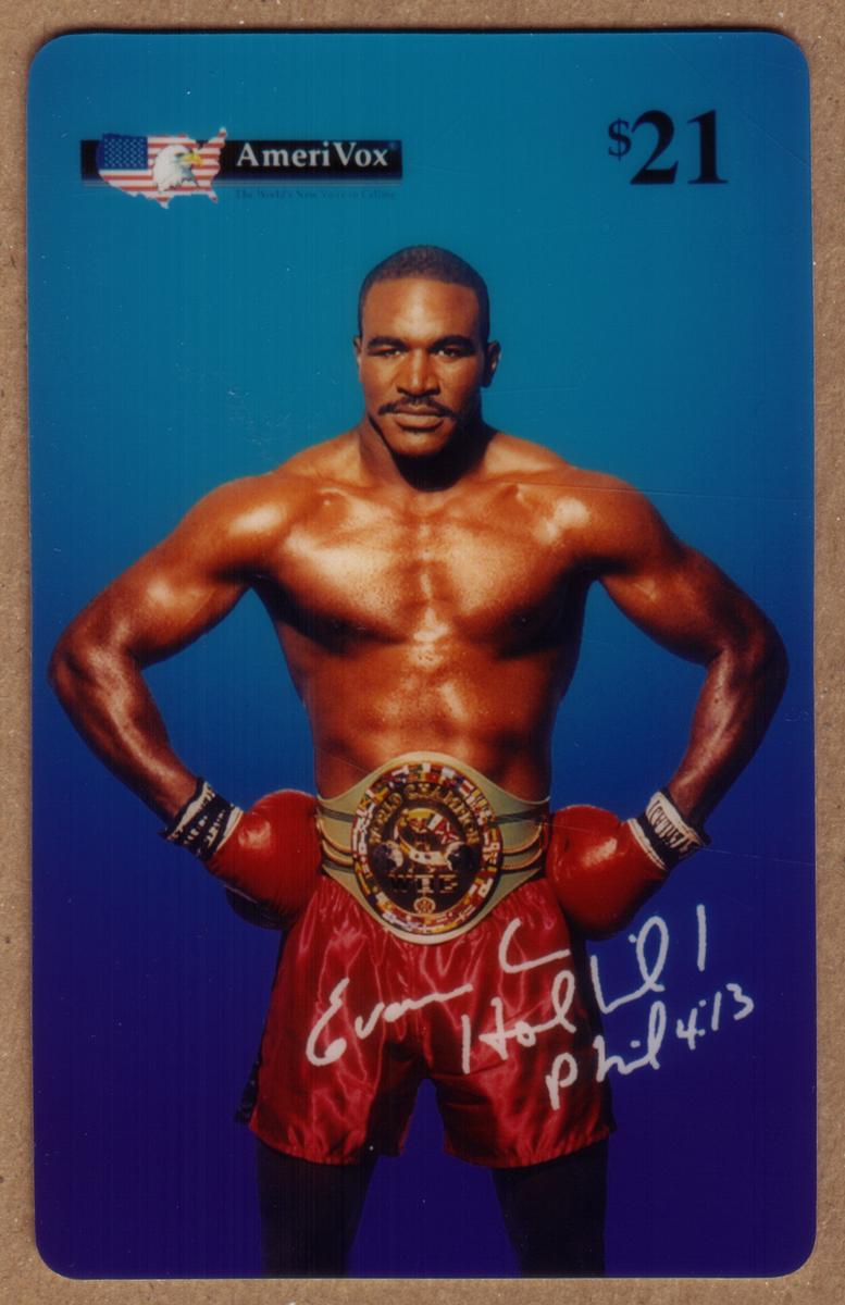 The card includes printed text with the name "Evander Holyfield," highlighting his identity as a famous athlete in professional boxing. The words “World Championship Boxing Belt” appear on the card, emphasizing the significance of the belt held by Holyfield. The overall design clearly connects to the theme of boxing and celebrates Holyfield’s achievements in the sport.