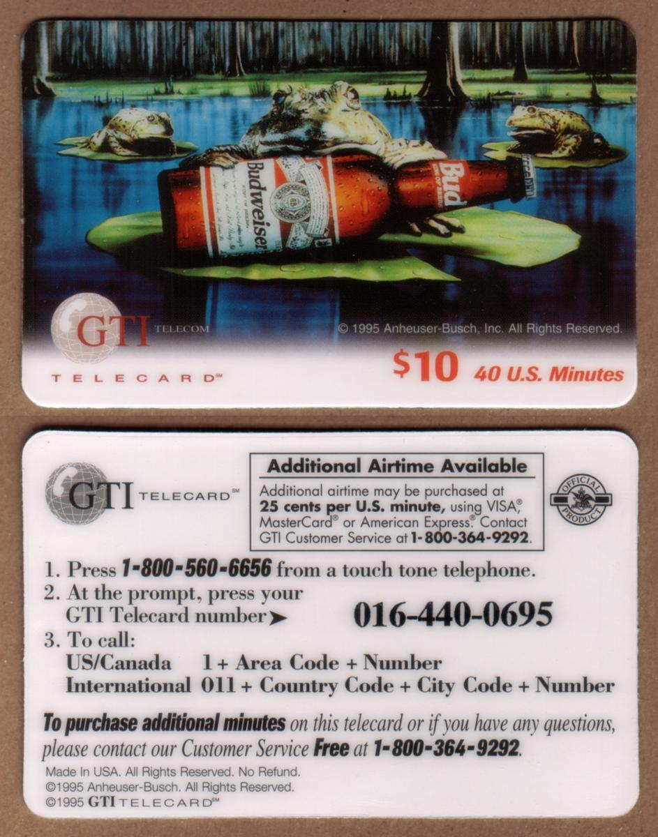 The design emphasizes the connection between the Budweiser beverage and the natural swamp habitat, using the frog and lily pad imagery to create a unique collectible telephone card. The card displays strong branding from Anheuser-Busch and GTI Telecom, making it a distinct promotional item for collectors interested in alcohol-related memorabilia or animal-themed phone cards.