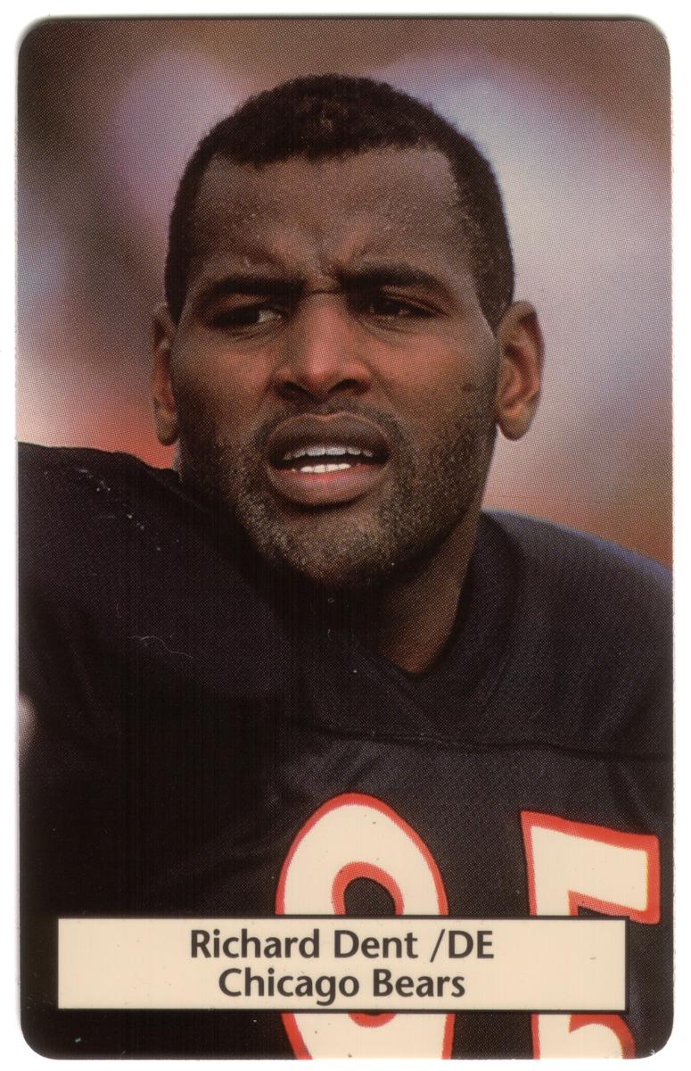 This collectible phone card features Richard Dent, a defensive end who played for the Chicago Bears in the NFL. The card is part of the NFL Players Association Series and highlights Dent’s role on the team. The main design includes a photograph of Richard Dent in his Chicago Bears uniform, focused and ready for action on the field. His uniform’s prominent colors are navy blue, orange, and white, consistent with the Bears’ team colors.