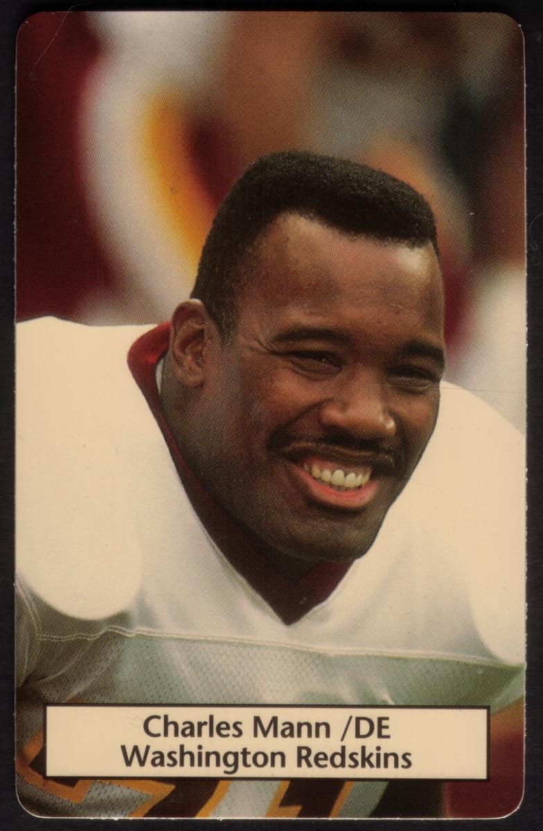 This collectible chip card features Charles Mann, a defensive end for the Washington Redskins football team. The card is part of the NFL Players Association series and showcases Mann in his Redskins uniform, with the team's logo clearly visible. The image captures Mann in a dynamic pose, emphasizing his role as a prominent NFL player.