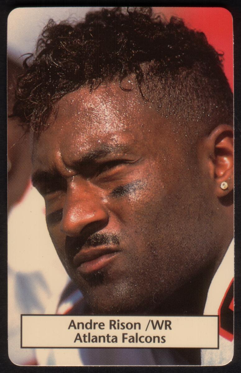 This collectible chip card features Andre Rison, a wide receiver (WR) for the Atlanta Falcons, associated with the NFL Players Association. The card highlights Rison in a football context, with his name "Andre Rison" and the abbreviation "WR" clearly printed alongside "Atlanta Falcons" on the card face. The card belongs to the NFL Players Association series and includes logos from the association. The overall design utilizes team colors and branding consistent with the Atlanta Falcons.