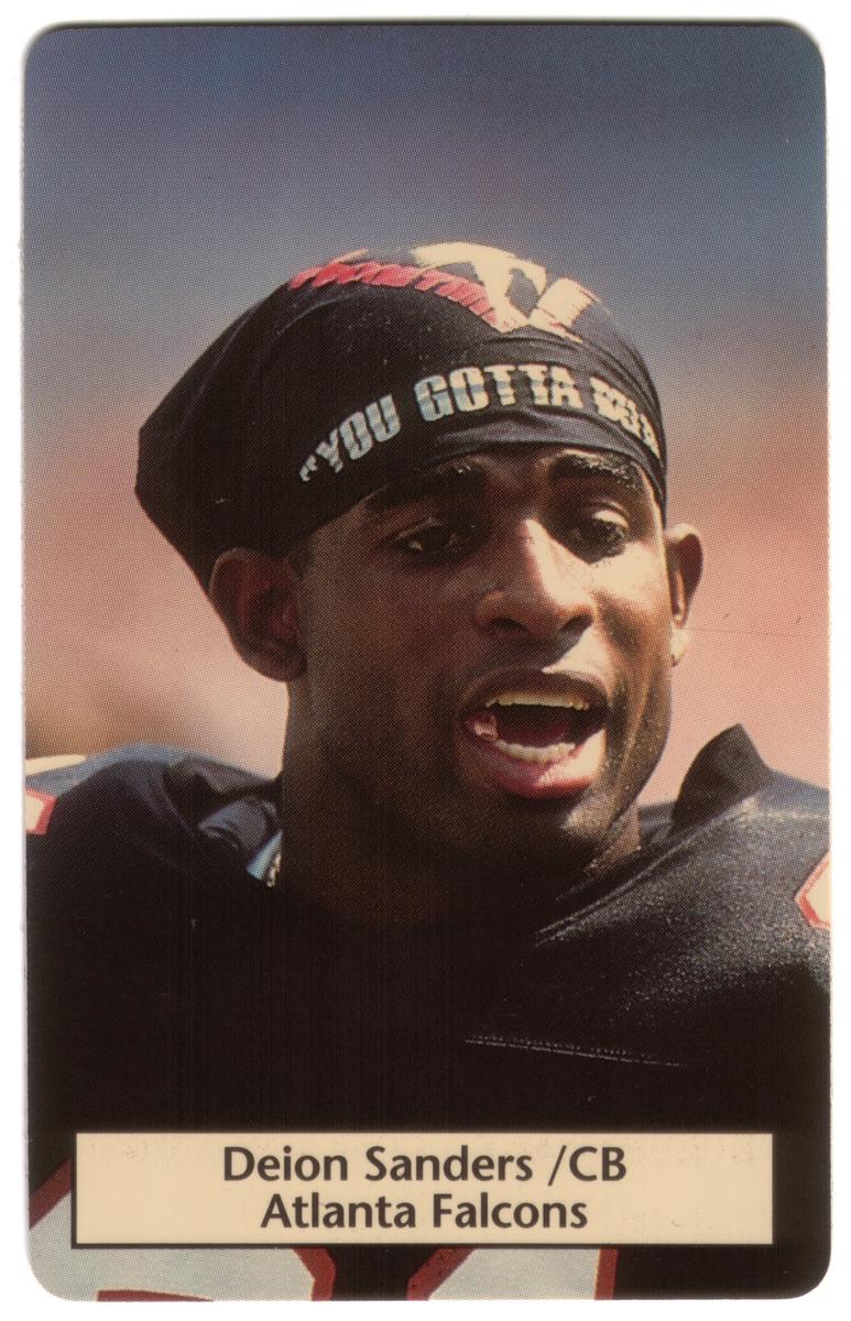 This card is a collectible item related to sports, specifically focusing on the NFL and the player Deion Sanders. It is designed for fans and collectors interested in professional football memorabilia.
