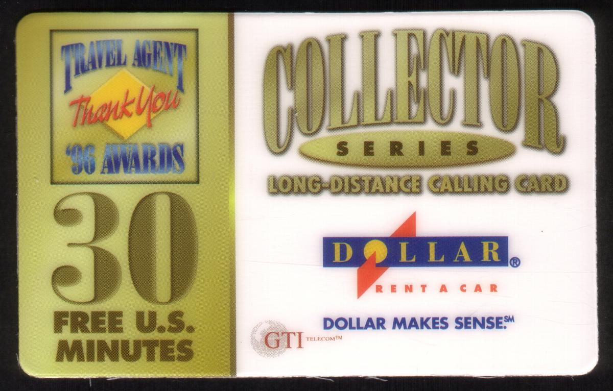 This collectible phone card is part of the 1996 Dollar Rent-A-Car Collector Series and features the text "Travel Agent Thank You 1996" prominently on its face. The card displays the Dollar Rent-A-Car logo in green and yellow near the bottom center. Above the logo, there is a rectangular white box containing the words "1996," "Travel Agent," and "Thank You" in black text. The upper right corner shows the payment value "30M" in bold yellow text against a blue background.