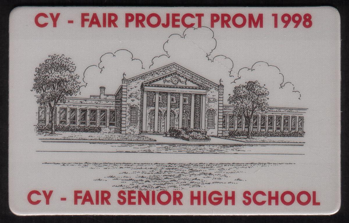 At the top of the card, “CY-FAIR SENIOR HIGH SCHOOL” is prominently printed, directly associating the image with the educational institution. Below the illustration, the text includes “1998 PROM,” tying the card to the year of the senior prom event at the school. The card is promotional in nature, commemorating this specific high school prom.