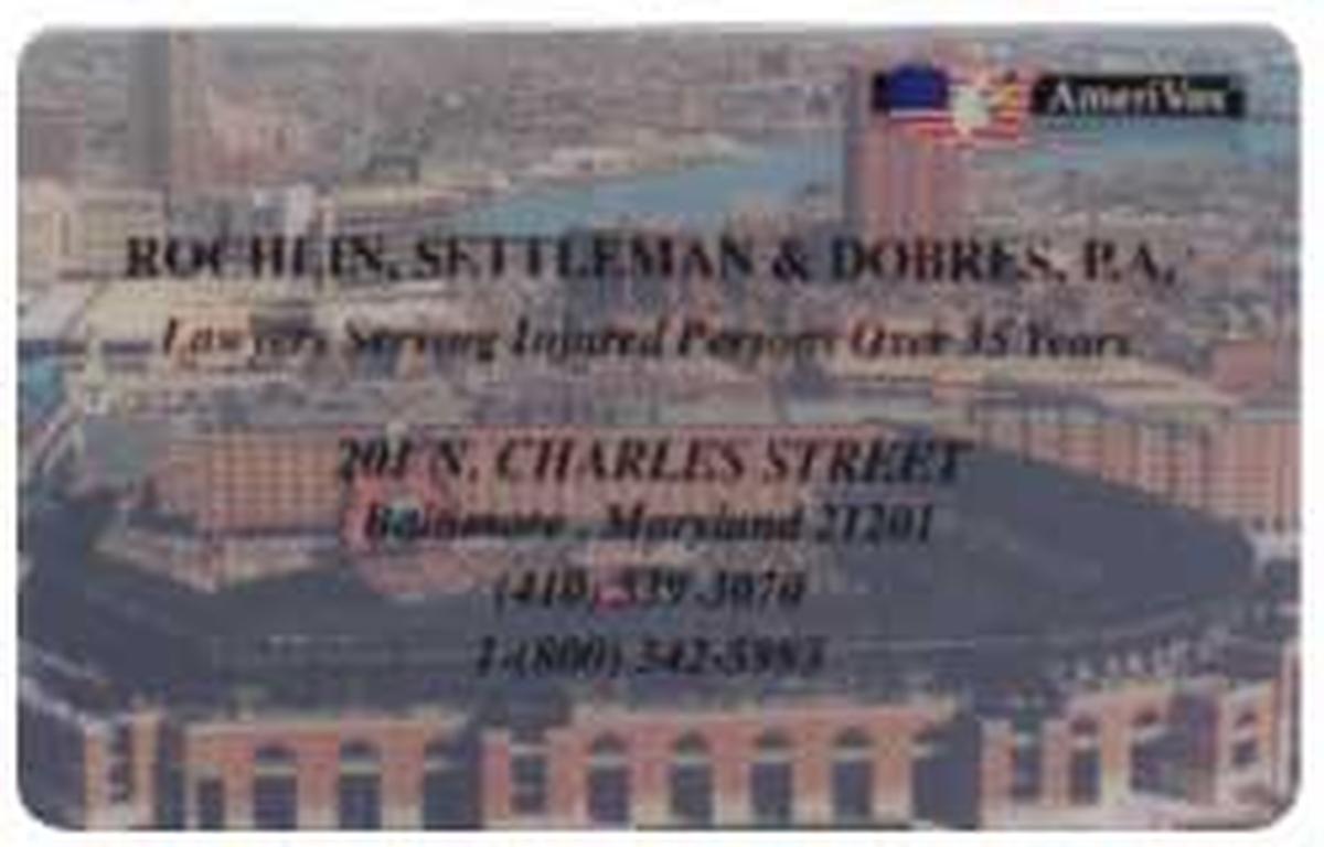 Baltimore law firm Rochlin, Settleman & Dobres, P.A. phone card featuring city skyline, stadium image, firm info, contact numbers, and AmeriVision branding. |