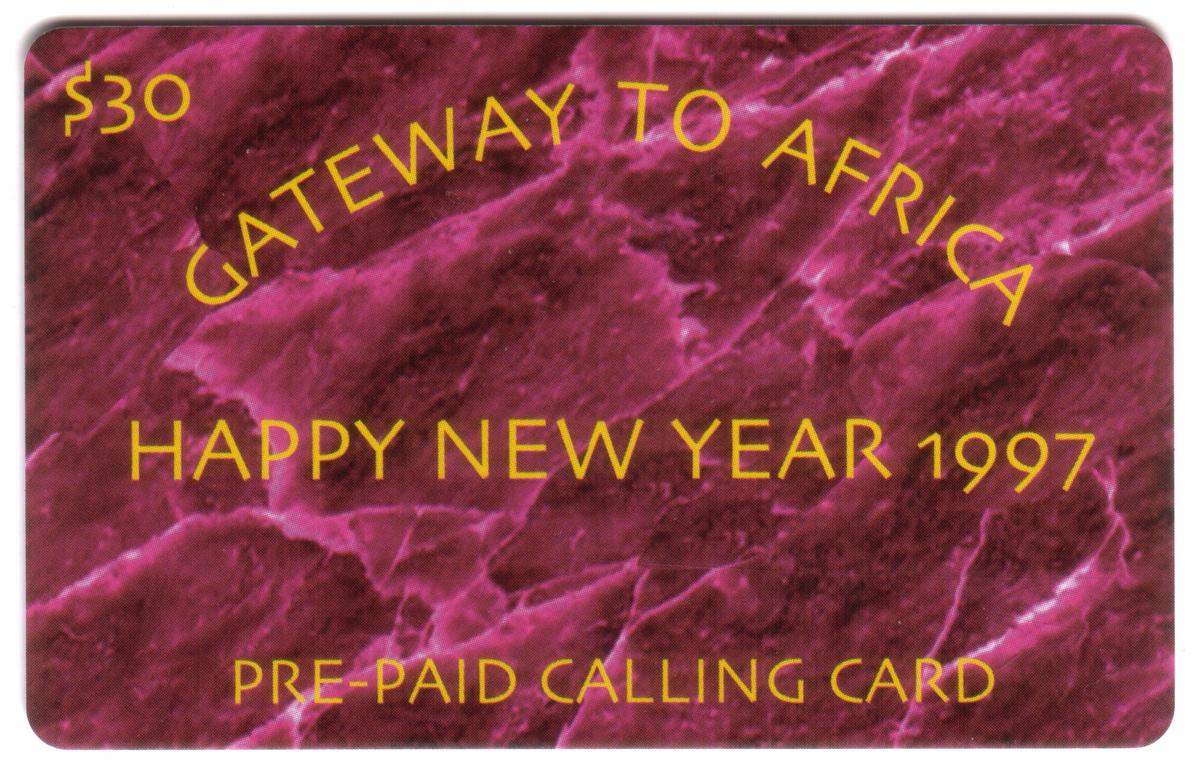 This collectible card features the phrase "Happy New Year 1997" prominently at the top, indicating a celebration of the New Year. The main image showcases a scenic view titled "Gateway To Africa," depicting traditional African huts situated in a natural landscape with a clear sky. The huts have thatched roofs, and the overall composition evokes a sense of cultural heritage and tranquility. The color palette includes warm earth tones and greenery, enhancing the natural and authentic feel.