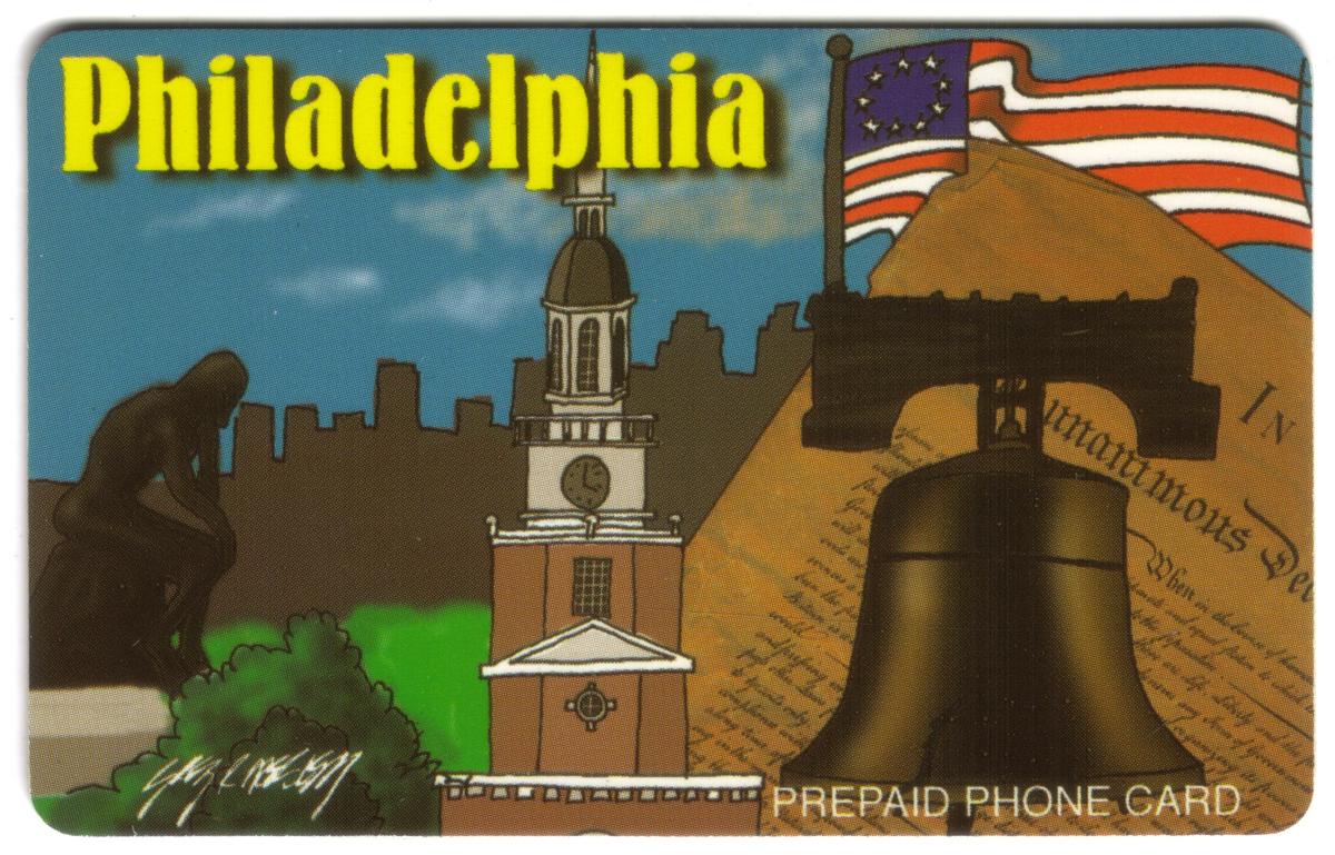 This collectible phone card features iconic symbols of Philadelphia, Pennsylvania, highlighting key elements of American history and patriotism. Prominently displayed are a stylized Liberty Bell and the American flag, both representing the city’s crucial role during the nation’s founding. The card also showcases Independence Hall, a historic building synonymous with the signing of the Declaration of Independence and early American architecture. The overall design includes vibrant red, white, and blue colors, reinforcing its theme of Americana and national pride.