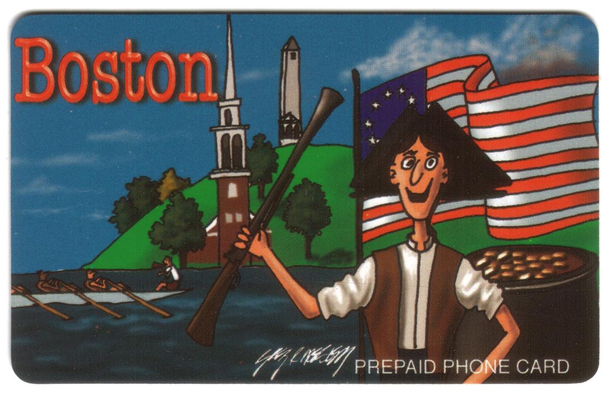 The lower portion of the card includes an artistic depiction of boating or rowing, with a group of rowers actively propelling their boat through the water, emphasizing a harbor or maritime theme. This ties the historical colonial imagery to the setting of Boston, Massachusetts, as indicated by the printed text on the card. The words "Boston, MA" appear in clear lettering, connecting the scene to this specific American city known for its rich history and waterfront.
