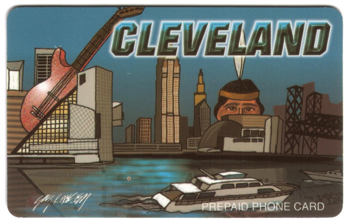 Cleveland-themed prepaid card featuring a city skyline, Native American imagery, boats on Lake Erie, and a guitar, celebrating culture, history, and maritime heritage. |