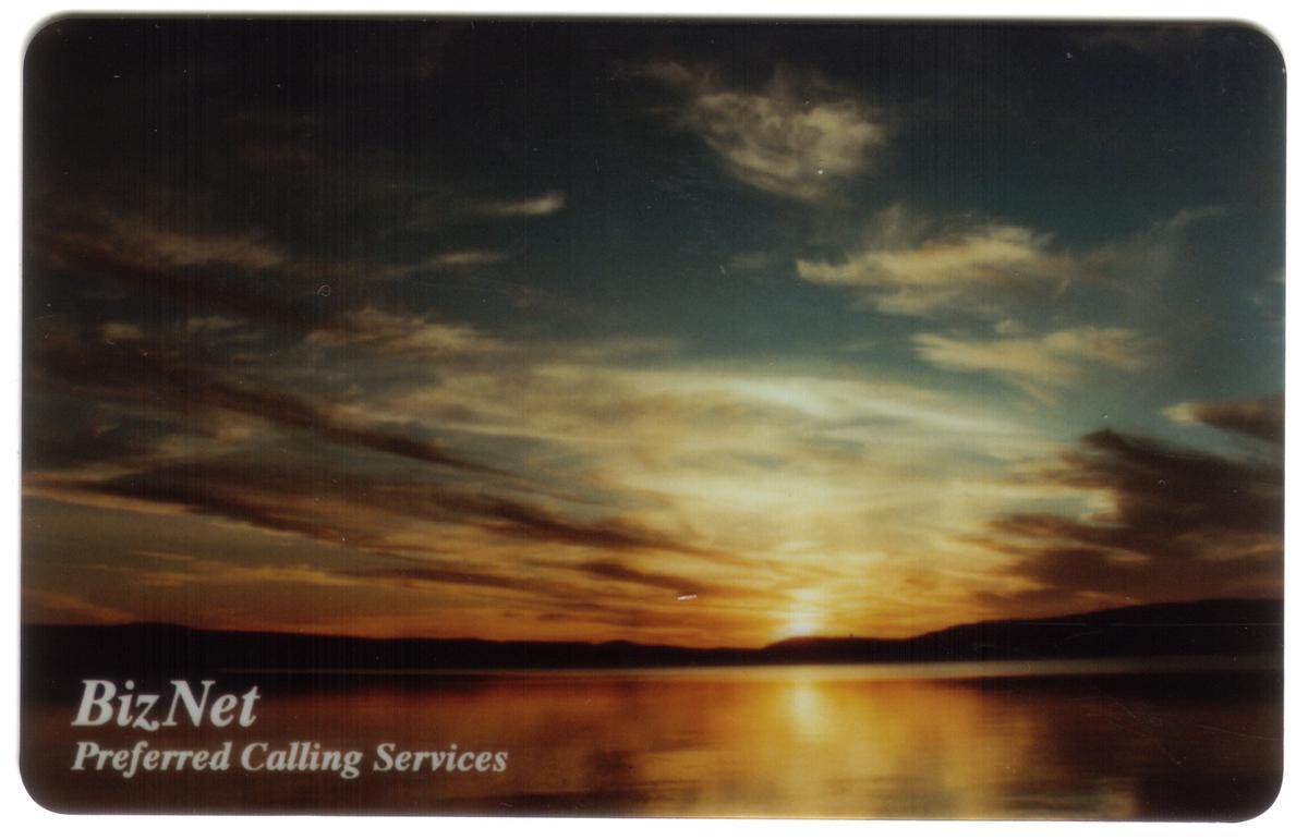 The card prominently displays the text "BizNet Communications" along the bottom right corner, identifying the telecommunications company associated with the card. The overall imagery captures a peaceful moment in nature with a harmonious blend of sky, water, and mountainous terrain, emphasizing the beauty of the sunset.