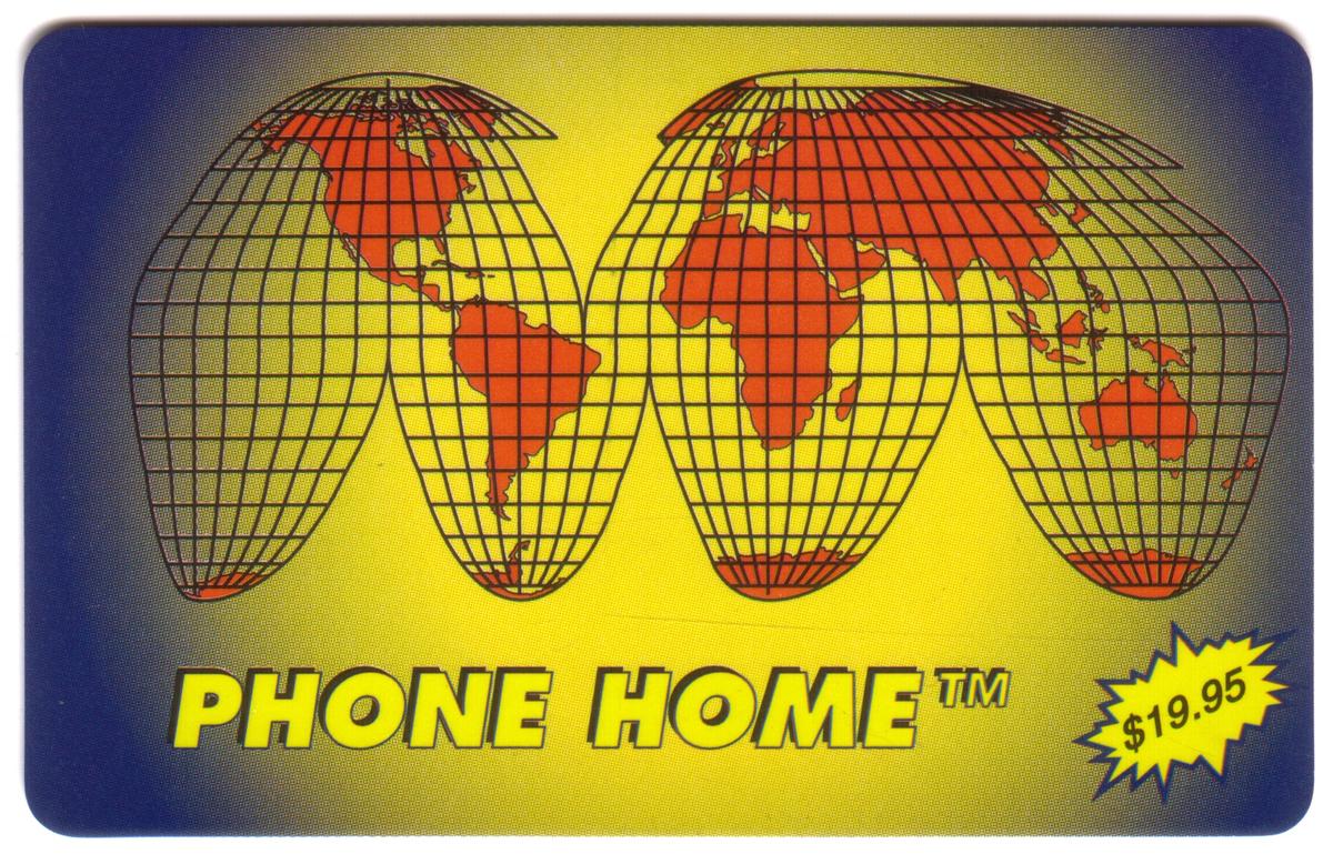 This collectible phone card titled "Phone Home" features a world map design with a color scheme dominated by a red land mass set against a bright yellow background. The map highlights geographical land outlines, showcasing continents and major land areas in vivid red, which contrasts strongly with the yellow background. The card includes text specifying "PhoneCard Associates" and the prominent label “Phone Home,” indicating its issuance by PhoneCard Associates.