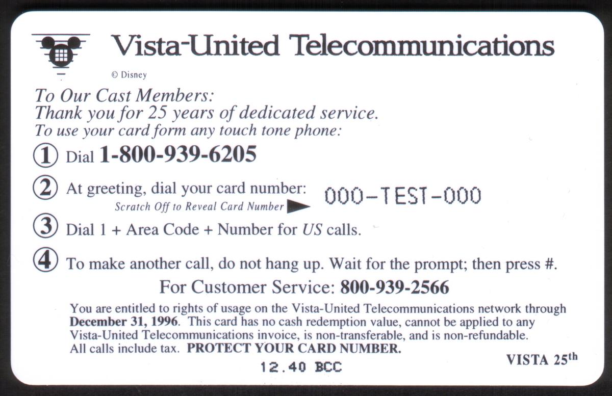 This phone card serves as a collectible item marking a significant milestone for Vista-United (Disney) and represents the blend of telecommunications and Disney's entertainment legacy. Its sleek design and clear branding make it a distinctive item for collectors interested in theme parks, Disney, and telecommunications memorabilia.