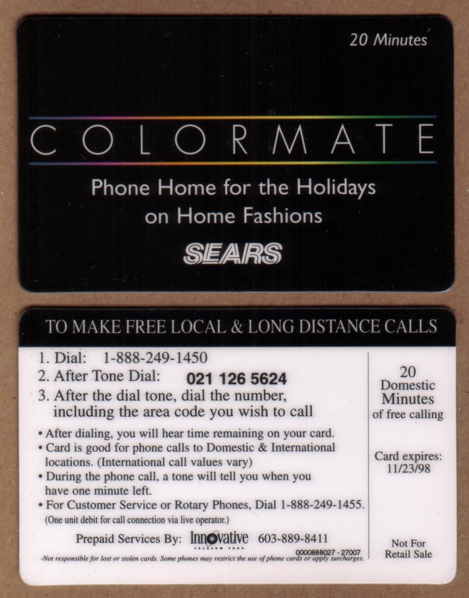 Text on the card includes clear mentions of Innovative Telecom and the promotional message encouraging customers to “Phone Home For The Holidays.” The card does not specify any numeric serial or identification codes other than those tied to the value and promotion. The overall presentation is clean and focused on the marketing message tied to the holiday season with Sears Colormate through Innovative Telecom.