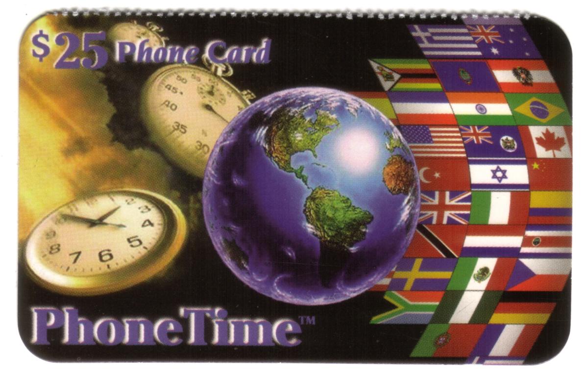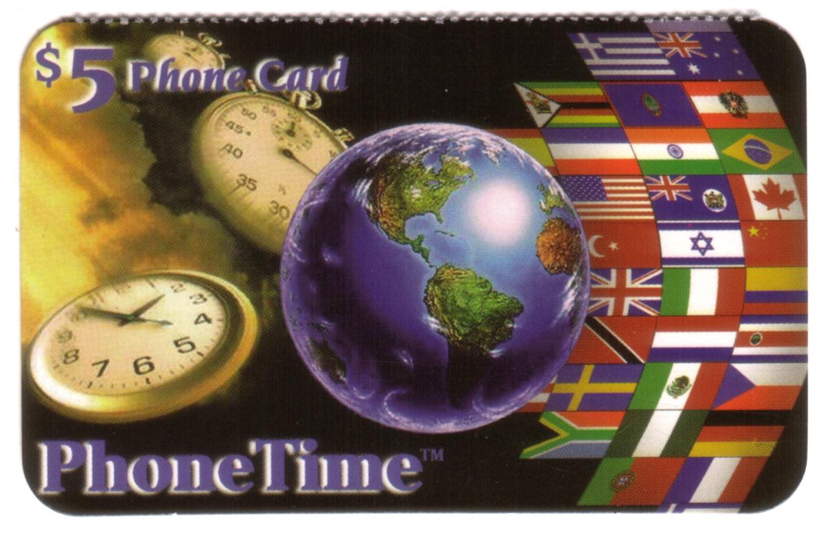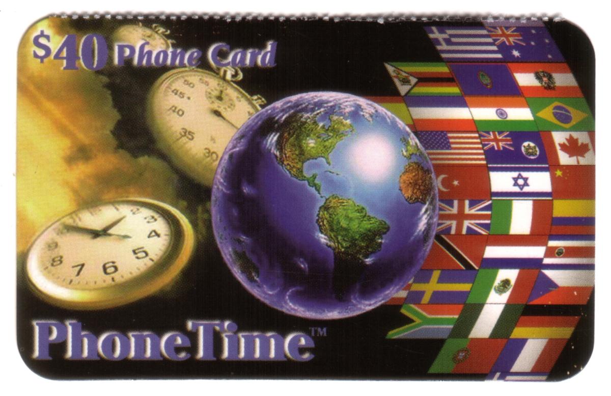 The phone cards are marked with denominations of $5, $10, $25, and $40, indicating the value associated with each card. The set is identified with the name “PhoneTime Globe, Watches, World Flags,” highlighting the key visual elements of globes, world flags, and timepieces. The issuer associated with this collection is Innovative Telecom, providing the telecommunications context for these collectible phone cards.