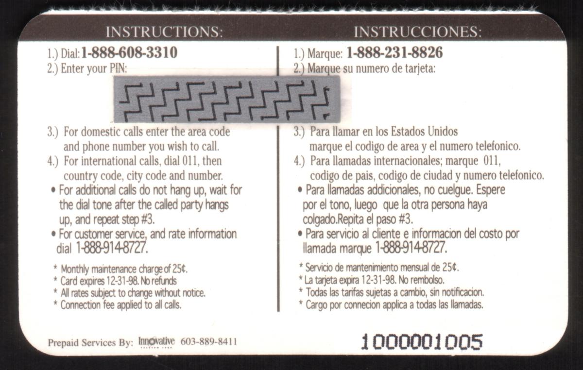 Since we have the world's largest inventory of USA phonecards for collectors, you will not necessarily receive the identical serial/batch/PIN number that we have scanned/pictured.