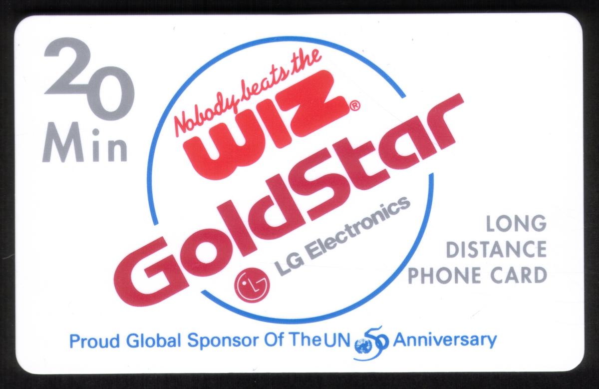 This phone card is associated with promotional branding emphasizing GoldStar’s global sponsorship, linking LG Electronics to the United Nations milestone. It combines corporate logos and anniversary commemoration in a simple, clean presentation suitable for use in telecommunications.