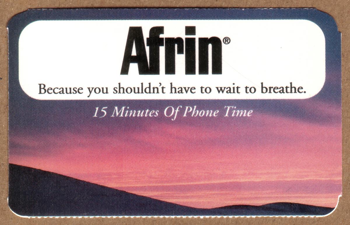 The card design prominently emphasizes the Afrin brand and its association with health-related advertising. The overall aesthetic is clean and straightforward, focusing on the product’s message and the time allotted for phone use. This phone card is intended for telecommunications purposes and does not include any medications.