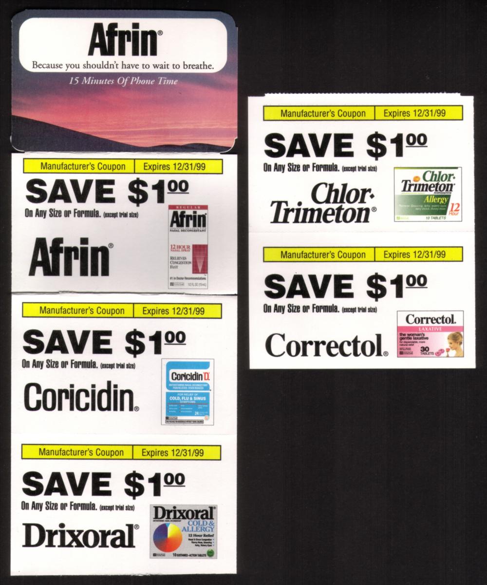 Late 1990s Schering-Plough promotional set with phone cards featuring Afrin branding and coupons for healthcare products, emphasizing savings and respiratory relief. |