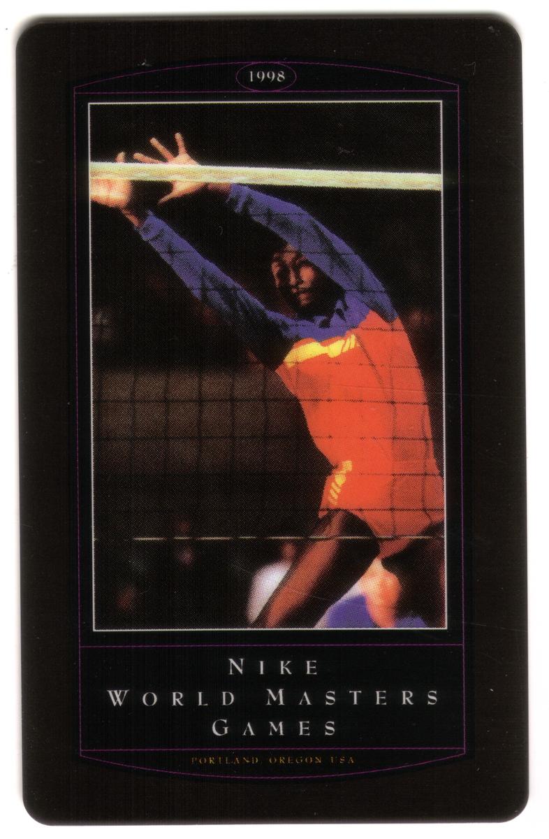 Below the image, the text "NIKE WORLD MASTERS GAMES" is printed in white uppercase letters. Further below, the card states "PORTLAND VERSION V31" in smaller text. The overall design highlights the sports theme of the event organized by BRVC Inc., commemorating the junior volleyball tournament sponsored by Nike.