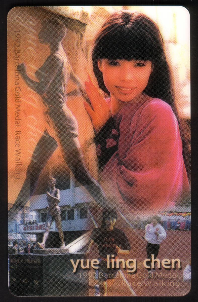 This collectible phone card honors Yue Ling Chen, the first Asian woman to win a gold medal in track and field at the 1992 Barcelona Olympics. The card features a large, smiling image of Yue Ling Chen wearing a pink garment, positioned prominently on the right side. To the left, there is a semi-transparent image of a female race walker mid-stride, capturing the motion and endurance of the sport.