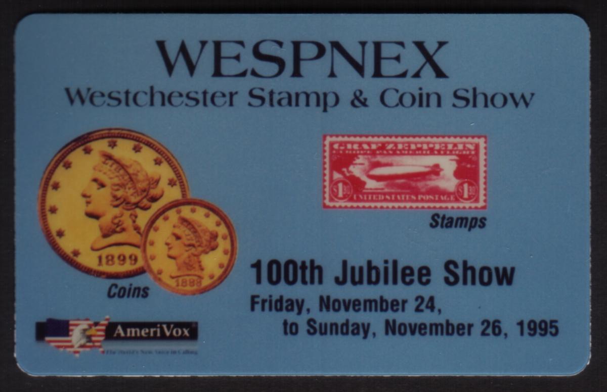 Westchester Stamp & Coin Show 1995 Jubilee commemorative telecard featuring gold coins, a zeppelin stamp, event details, and AmeriVox branding. |