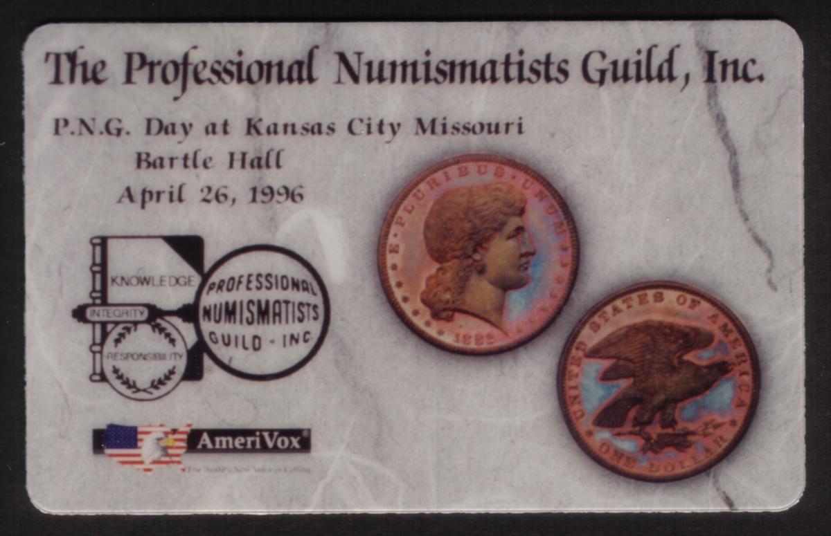 The card includes information related to an event titled “5m PNG Day At Kansas City, MO (04/96),” which connects it to the location of Kansas City, Missouri, and the timeframe of April 1996. This ties the collectible to a specialized gathering involving professional numismatists and enthusiasts of silver dollars and silver coins. The card also references Bartle Hall, a well-known convention and exhibition center in Kansas City, MO, often used for major numismatic events.