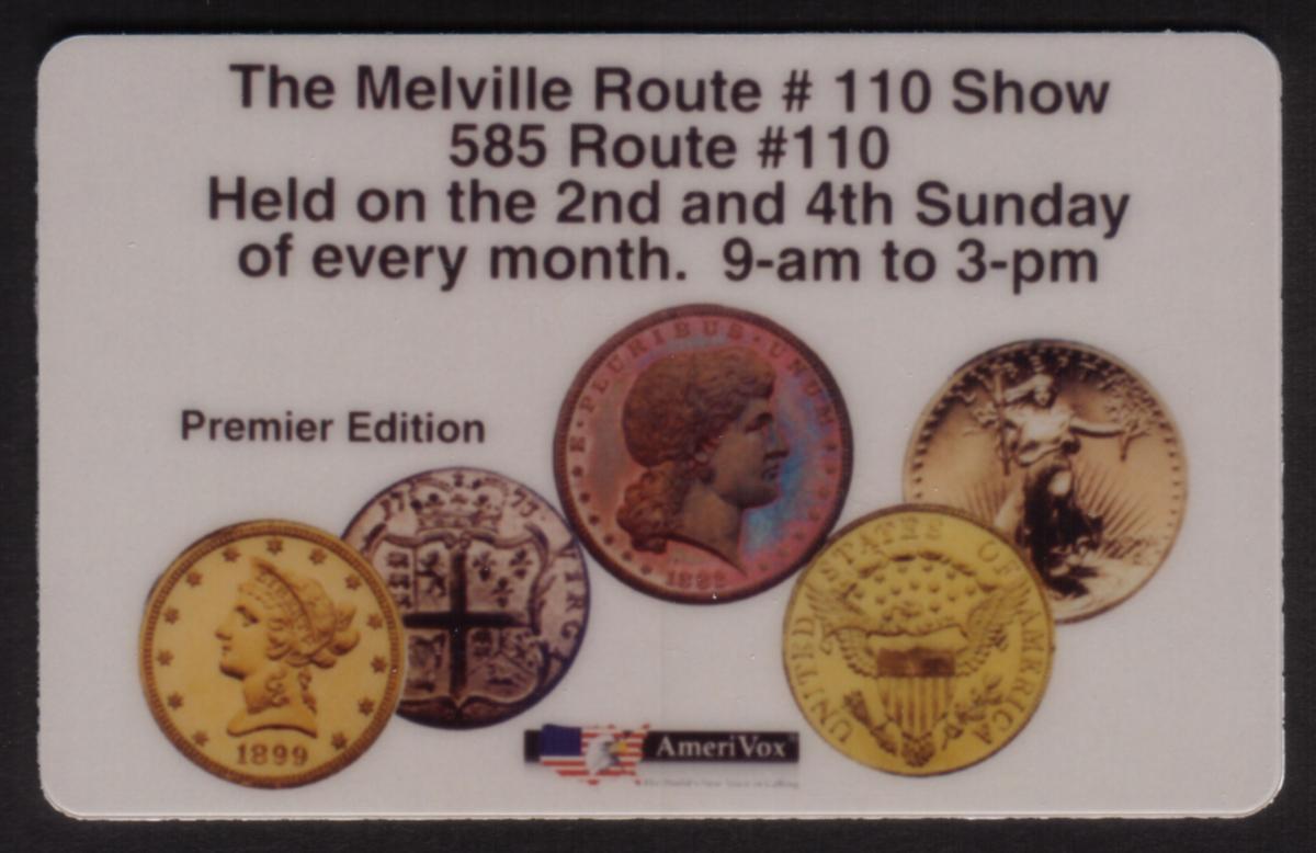 Promotional phone card for Melville Route 110 Show featuring gold and silver coin images, event details, and AmeriVox branding, ideal for collectors. |
