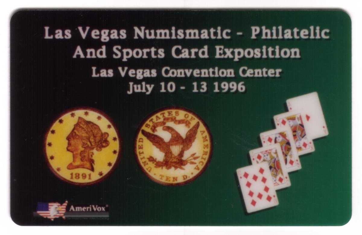 Commemorative phone card featuring 1996 Las Vegas expo, gold coins, poker imagery, and AmeriVox branding, celebrating collectibles, gambling, and memorabilia. |
