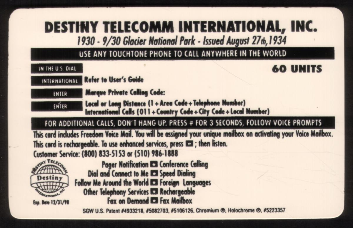 The card includes text indicating "60 Units" in the upper left corner and the word "Glacier" in stylized script in the upper right corner. A round Destiny Telecomm logo is located near the bottom right corner of the card, featuring blue, orange, and white colors. The overall design highlights the Americana and nature-focused themes of Glacier National Park, mountains, lakes, and scenic views, connecting to philately and stamp collecting interests.