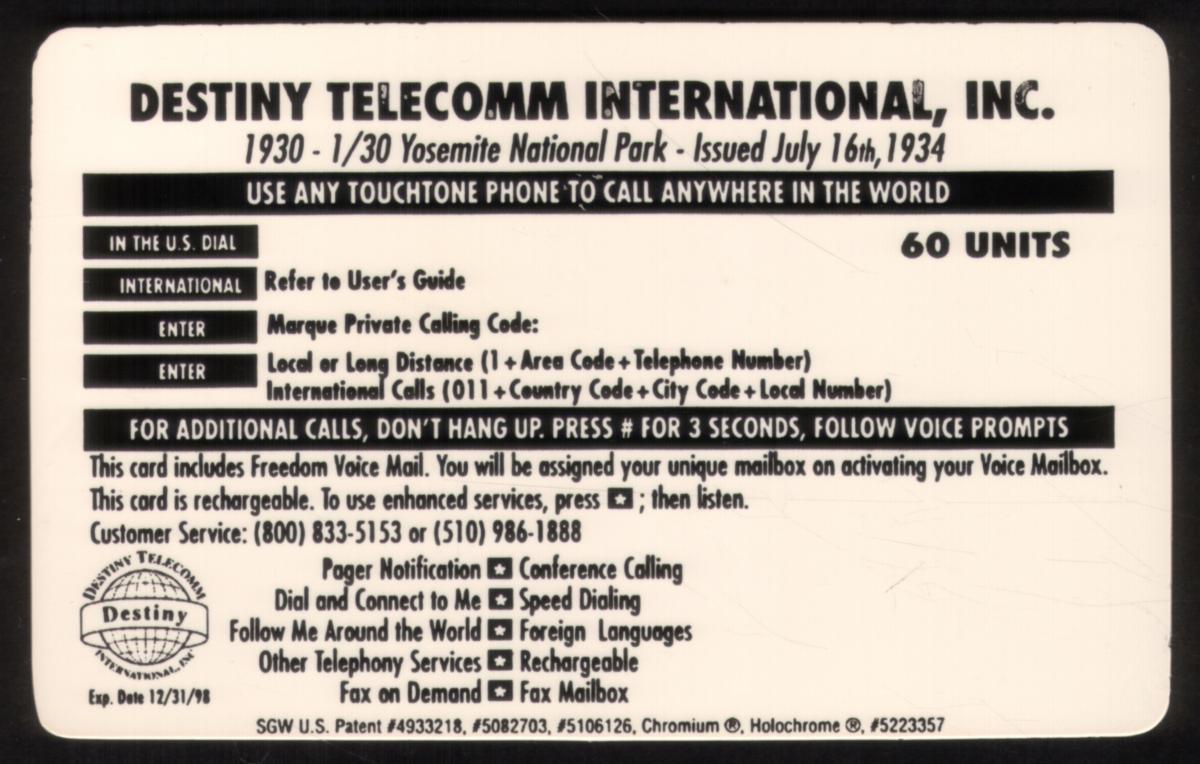 The background of the card is a textured deep purple color. At the top left corner, "60 UNITS" is printed in white, indicating the card's unit value. The word "Yosemite" appears in white stylized script near the top center of the card. In the bottom right corner, there is a circular emblem containing the text "Destiny Telecomm International" around a blue and orange gradient center, identifying the card issuer.