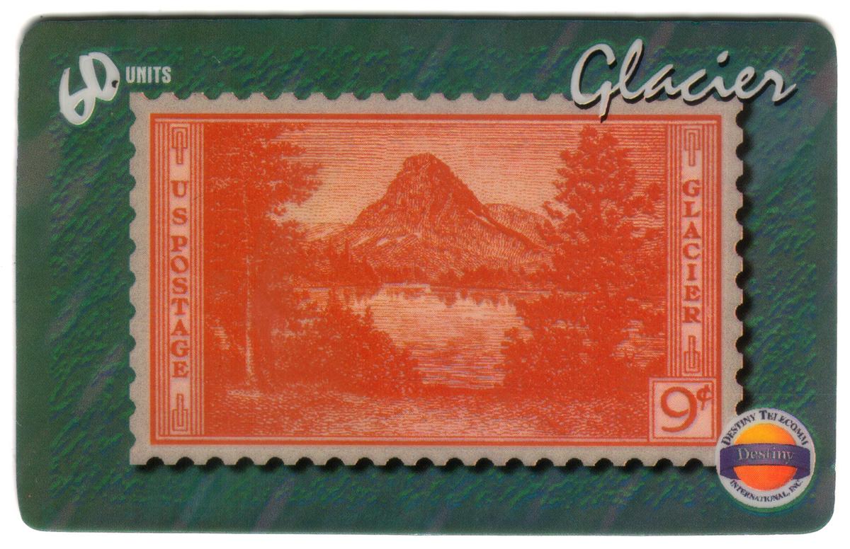 Vintage Glacier National Park 9-cent stamp phone card featuring mountain, lake, pine trees, and Americana nostalgia, with collectible and functional appeal. |