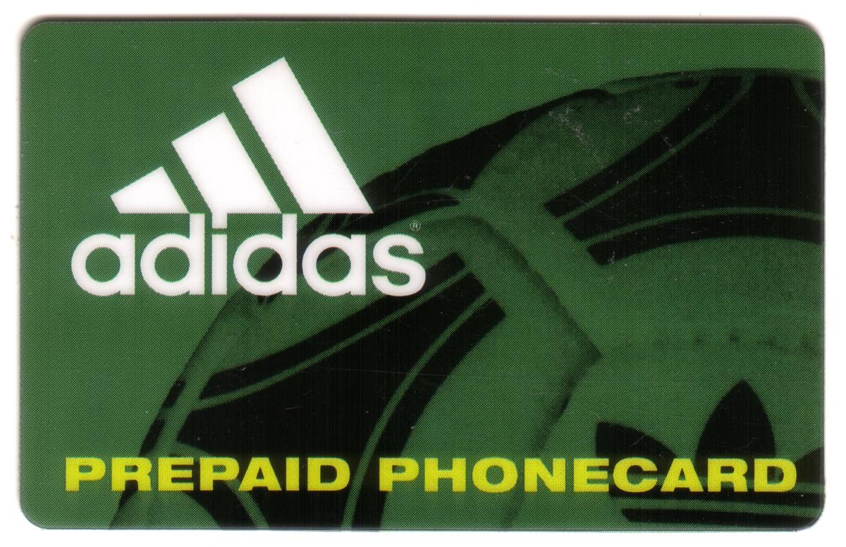 Overall, the card combines sports-related visuals with corporate logos, highlighting both soccer and Adidas branding, along with the phone card’s functional value as a prepaid calling card. The design is clean and focused on these key elements.
