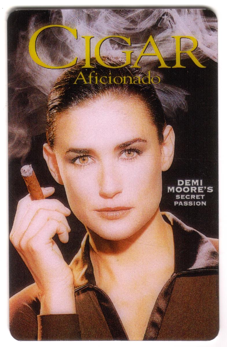 Demi Moore Cigar Aficionado promotional card from 1996 featuring her holding a cigar, highlighting luxury lifestyle, celebrity culture, and charitable fundraising. |