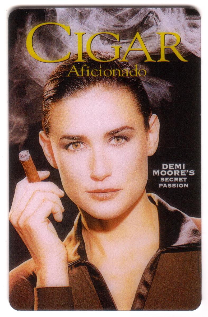 The card prominently displays the title "CIGAR Aficionado" at the top in large, bold yellow lettering. To the right of Demi Moore’s face, the text reads "DEMI MOORE’S SECRET PASSION," referencing her feature in the magazine. The overall tone of the image is polished and sophisticated, emphasizing the theme of celebrity and cigar culture.