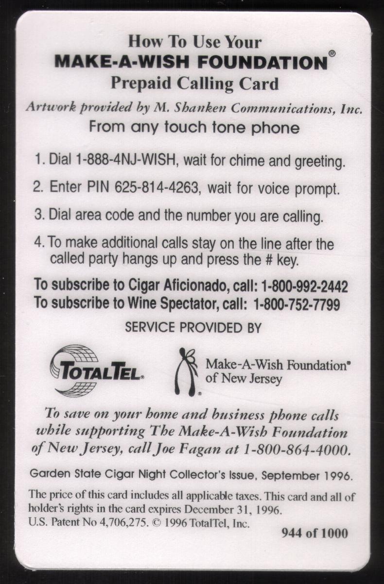 This item relates to a promotional association involving Demi Moore, Cigar Aficionado magazine, and the Make-A-Wish Foundation of New Jersey. It also connects to entertainment and Hollywood themes, with references to M. Shanken Communications and Garden State Cigar Night included in the keywords. The card captures a moment tied to a September 1996 event centered on cigar aficionados and charitable efforts.