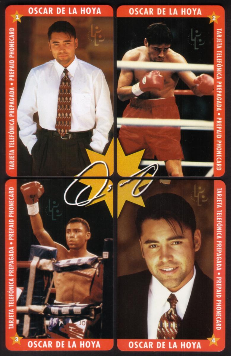 This set of four prepaid phone cards features Oscar De La Hoya, a famous professional boxer. The cards are numbered 1 through 4, each showing different images of De La Hoya related to his boxing career and public persona. The cards are bordered in red, with the text "TARJETA TELEFÓNICA PREPAGADA • PREPAID PHONECARD" written vertically along the left or right side of each card.