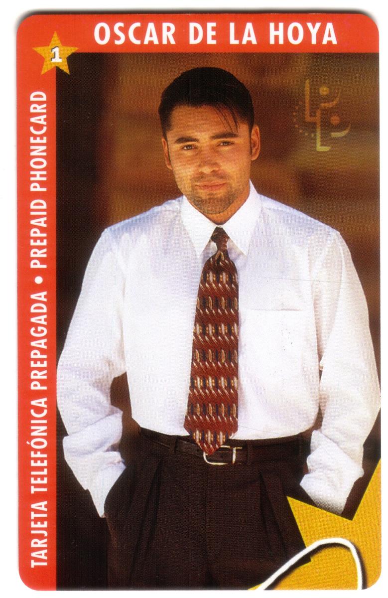 Card number 1 displays Oscar De La Hoya in a formal setting wearing a white dress shirt and a patterned necktie. He is posed with his hands in his pockets, looking directly at the camera. The name "OSCAR DE LA HOYA" is printed at the top with a yellow star indicating the card number in the upper left corner.