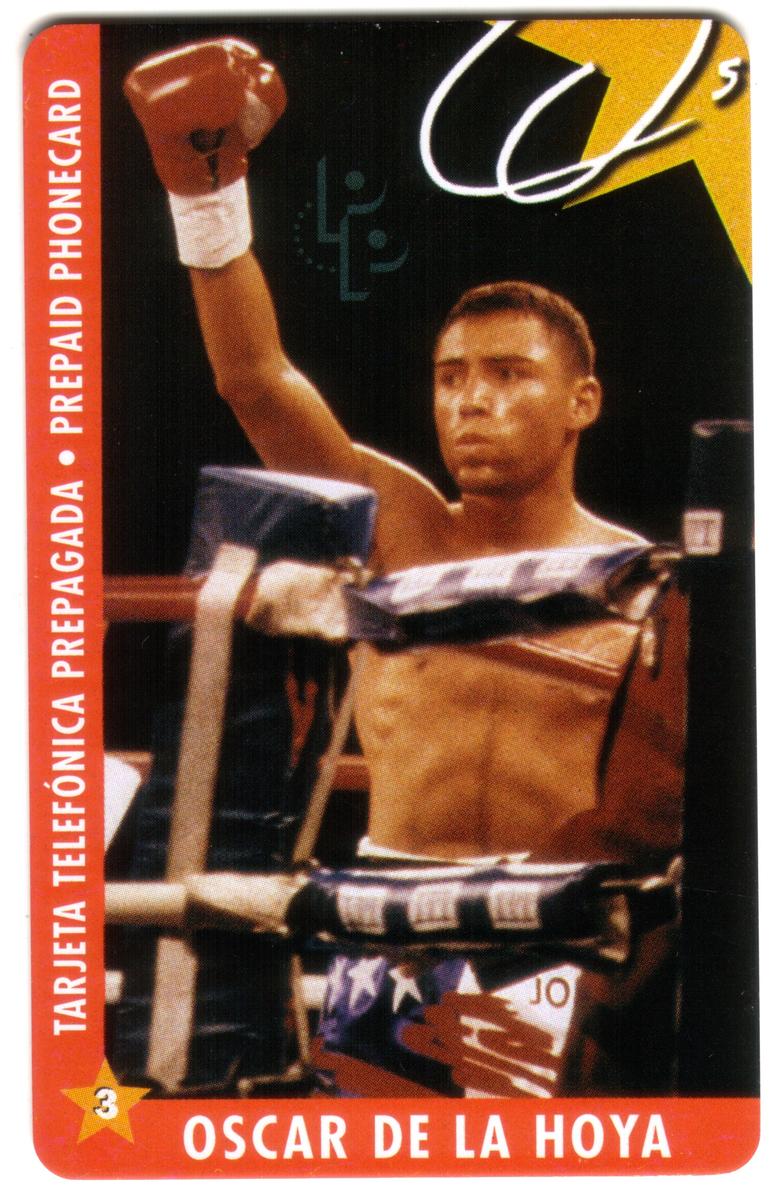 Card number 3 shows De La Hoya standing in a boxing ring corner with one raised arm, wearing red boxing gloves and blue boxing trunks with a white star pattern, appearing to acknowledge the crowd or a signaling gesture. The name "OSCAR DE LA HOYA" appears along the bottom of the card, with a yellow star showing the card number 3.