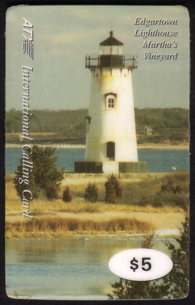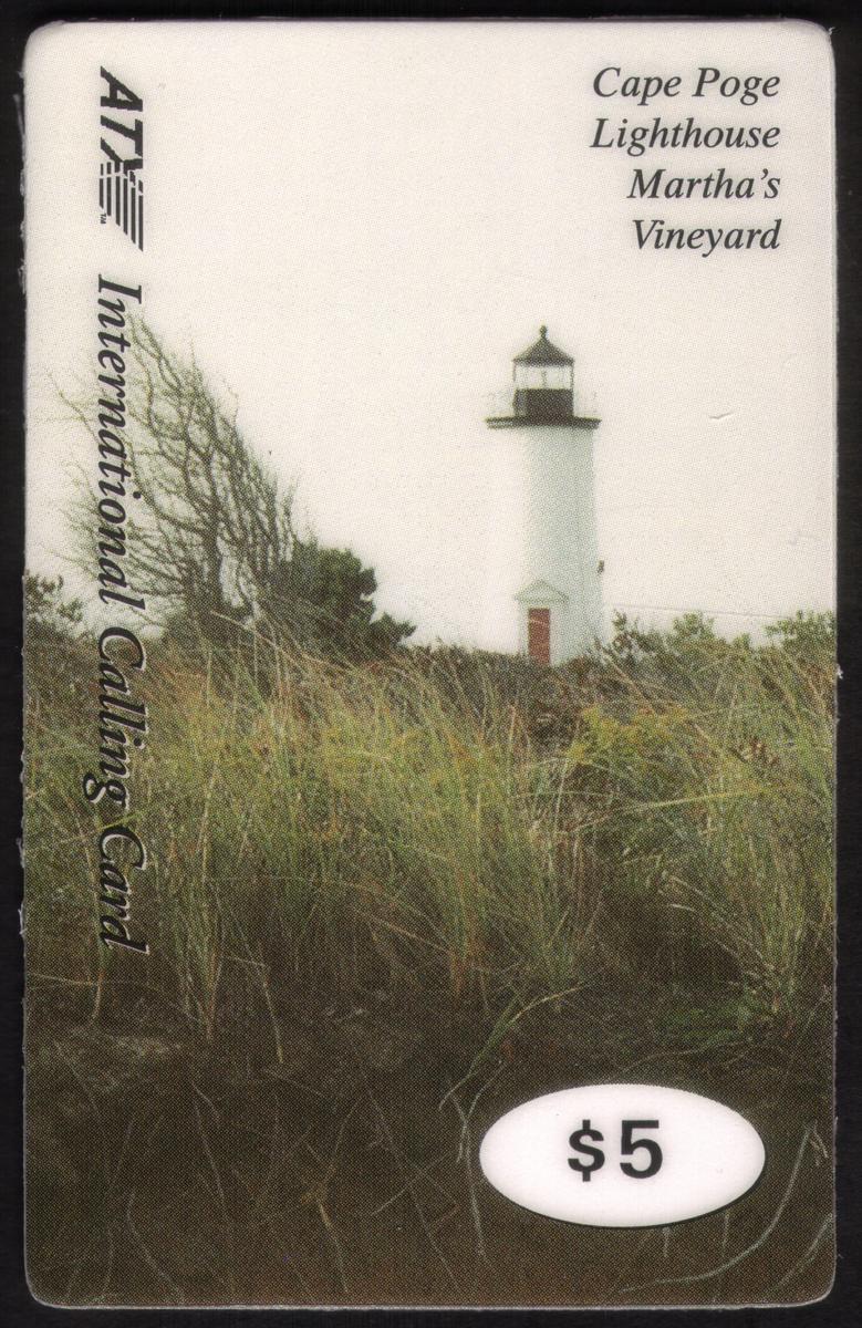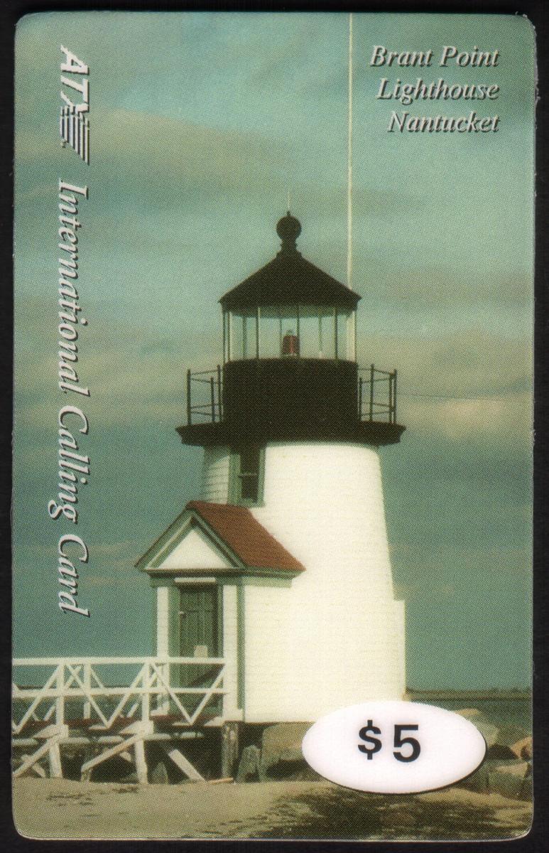 This set of nine collectible AT&T International Calling Cards each features a vivid photographic image of a notable lighthouse or scenic beach from Nantucket, Martha’s Vineyard, and Cape Cod, highlighting popular tourist attractions in New England. Each card has a clear $5 value displayed in an oval at the bottom right corner. The AT&T logo with the text "International Calling Card" is placed vertically along the left side of every card. The names and locations of the lighthouses or beach are printed at the top right corner of each card in matching font style.